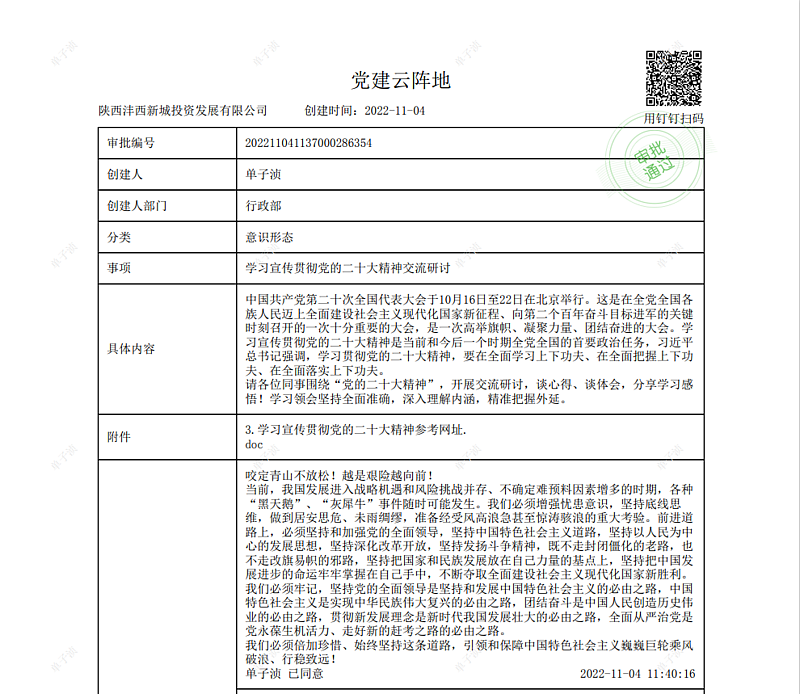 “我來說說黨的二十大報告里的關鍵詞—‘團結’,團結奮斗是我們黨過去取得成功、現在爭取成功、將來繼續成功的寶貴經驗,是中國共產黨百年光輝歷程的主旋律,”這是灃西投資黨支部在釘釘黨建云平臺上發起的一場二十大理論“微宣講”活動的交流討論?!拔⑿v”是創新宣講活動的一次有益嘗試,灃西投資黨支部不斷拓寬宣講渠道,在鞏固宣講人員線下+多媒體宣講的前提下,發揮網絡渠道宣講不受時間、地點限制的優勢。除線下面對面、點對點宣講外,在釘釘黨建云平臺、微信交流群發起系列宣講學習交流討論活動,不斷擴大宣講覆蓋范圍和感染力,讓大家能入腦、入心、可落實、聚人氣。