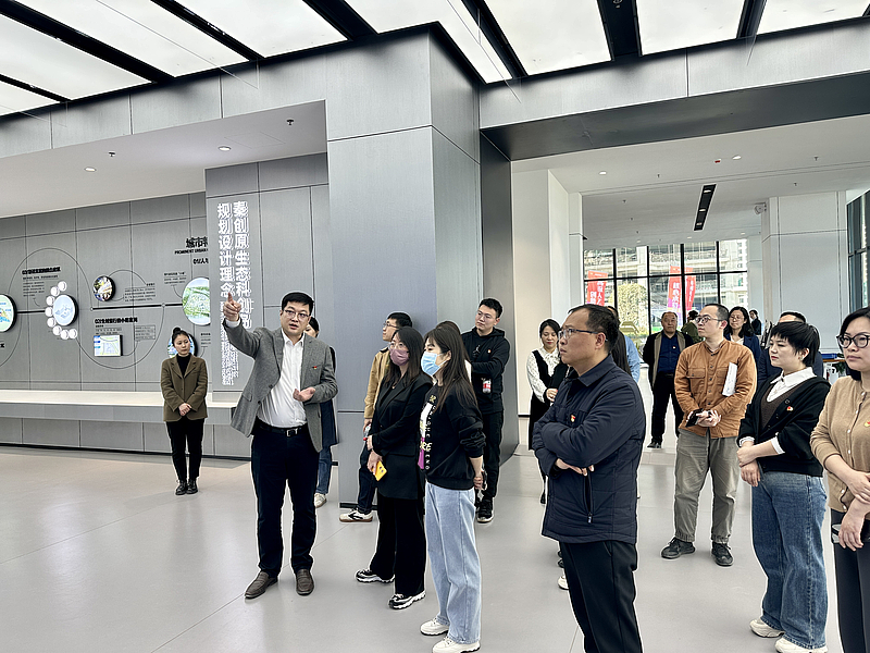 活動中,全體人員前往秦創原生態科創島城市規劃展廳,聽取講解員介紹秦創原生態科創島的整體規劃、產業配套、建設進展等情況,集中觀看項目建設最新進度視頻短片;接著參觀秦創原生態科創島沙盤模型,深入了解項目業態分布、建設進展及載體招商等情況。隨后,雙方實地調研5單元6、8號樓項目現場,了解目前項目建設進展情況,雙方圍繞新時代人才隊伍建設、科創載體招商工作等重點內容開展交流研討。