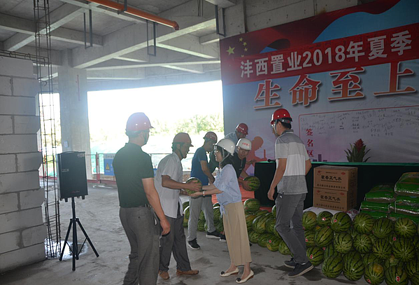 近期持續高溫,又正逢施工高峰期,為落實公司以人為本的管理理念,確保一線施工人員暑期施工安全,7月25日上午,陜西省灃西置業有限公司開展2018年夏季“送清涼、促生產”活動,為公司在建項目送去防暑降溫品,把對施工人員的關心關懷送到項目一線。
