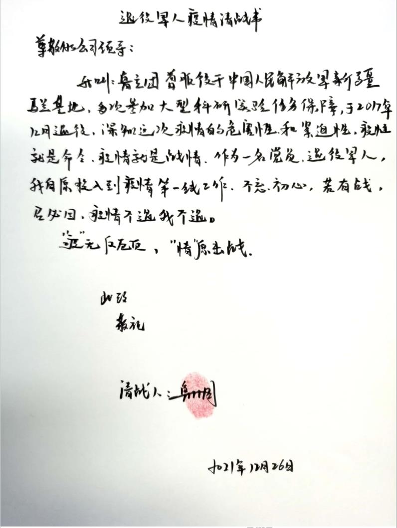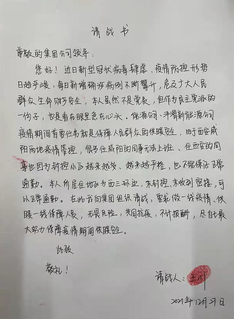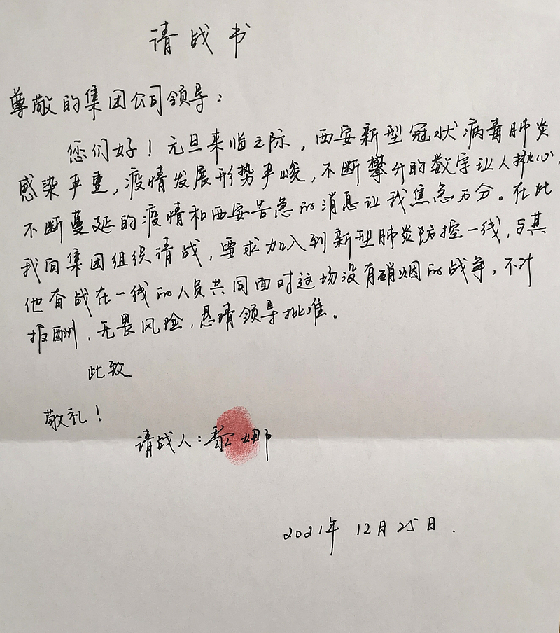 “本人居住小區(qū)未被封控,可以保證正常通勤,我向組織請戰(zhàn),要求做一線防疫、供暖保障人員,無畏風(fēng)險、不計報酬!”這是一名80后員工,她叫王川,是灃西集團下屬子公司能源公司的一名員工,在防疫工作開始后,她一貫沖在前干在前,值班時總是要求第一班。為了讓其他同事可以休息,可以輪休的情況下依然堅持每天到公司到崗上班,保證工作不斷檔。公司在防疫執(zhí)勤點排班時主要安排男同志,但身為女同志,她多次申請前往一線。12月27日,在全市新一輪核酸檢測行動開始前,王川同志主動手寫請戰(zhàn)書,再次要求到一線防疫!目前在灃西新城馬王村開展防疫工作。