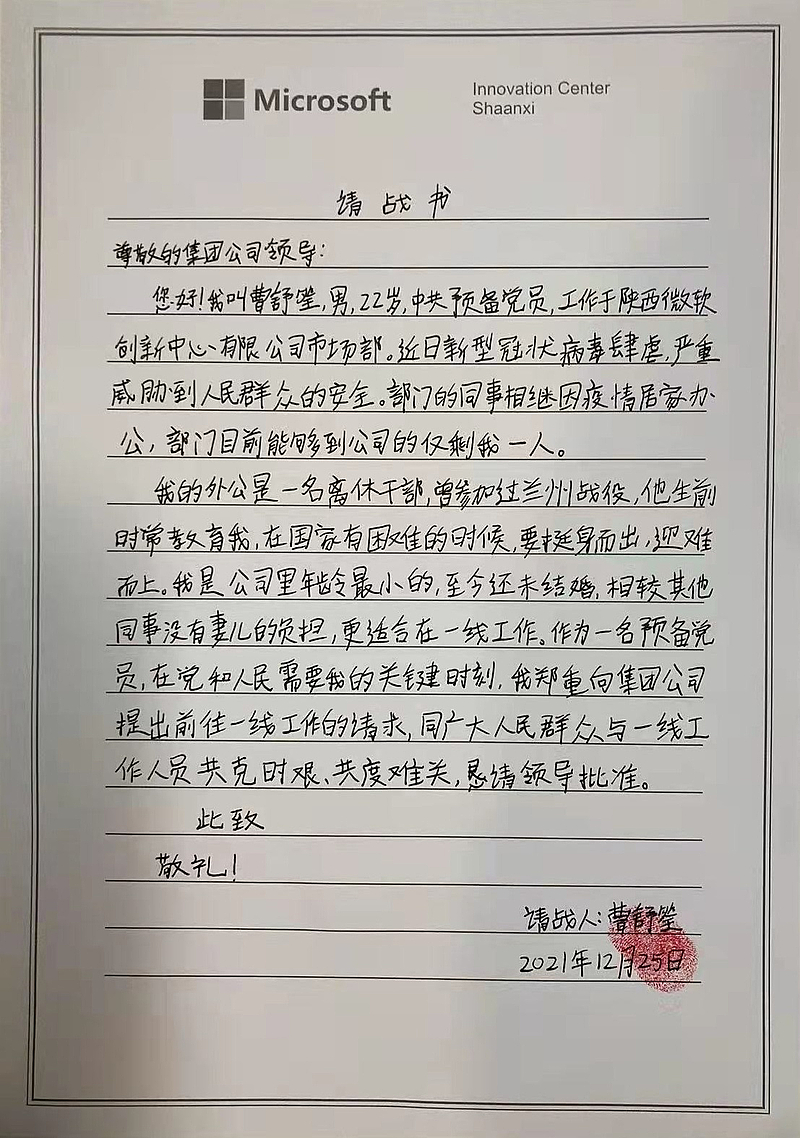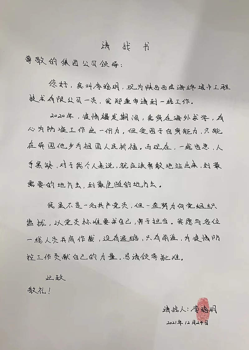 “我是土生土長的灃西人,對附近村子情況比較了解,我申請出戰(zhàn)抗疫一線!”“作為一名共青團員,深知此次防疫責(zé)任重大、人員緊缺,我堅決服從組織調(diào)配!”“來到公司剛好三個月,期間感受到了組織的溫暖,現(xiàn)在組織需要我,我申請出戰(zhàn)!”“我曾參與2020年疫情防控工作,對防疫工作比較熟悉,能夠更快進入工作狀態(tài),請組織批準(zhǔn)出戰(zhàn)!”........
