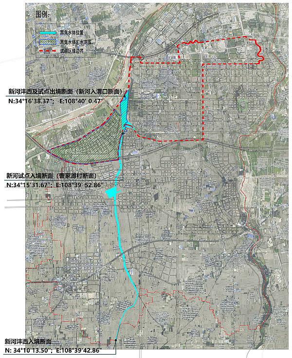 由于新河及其支流河道沿途村莊、企業(yè)較多,生活污水、企業(yè)及畜禽養(yǎng)殖廢水大量直排,河底淤泥堆積、水流較緩,加之水體自凈能力差,引發(fā)黑臭。2016年監(jiān)測(cè)顯示,新河整體表觀質(zhì)量較差,進(jìn)入西咸新區(qū)灃西新城前已明顯黑臭,主要超標(biāo)指標(biāo)為透明度、氨氮、ORP,等級(jí)為輕度黑臭。