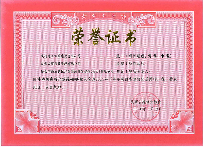 新業佳苑4#樓榮獲陜西省建筑優質結構工程