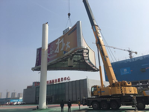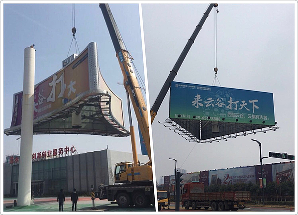 信息產業園公司道路兩側共有三面廣告立柱兩處,分別位于西部云谷一期、二期道路兩側,柱高25米,總面積882平方米。3月7日早7:30,相關人員到位,大吊車進場,拆除工作正式開始,執法局的同志到場督導,配合道路封閉及安全警戒工作,下午15:00兩處廣告牌全部順利拆除完畢。