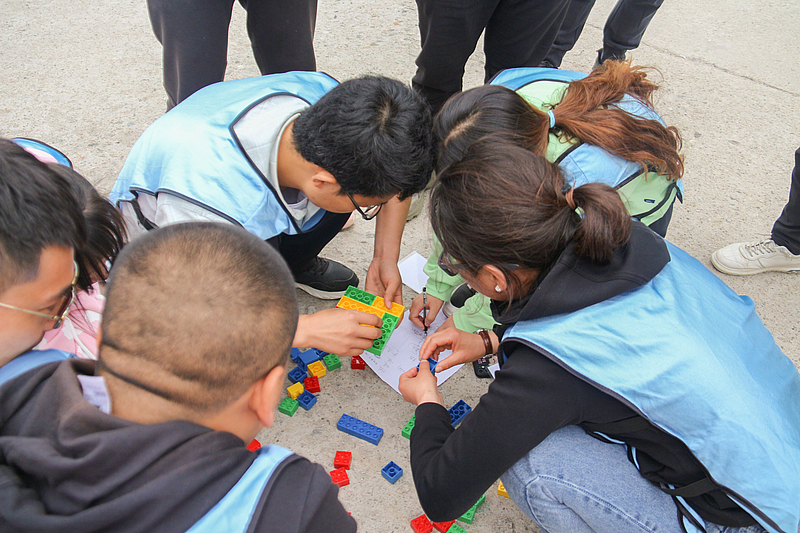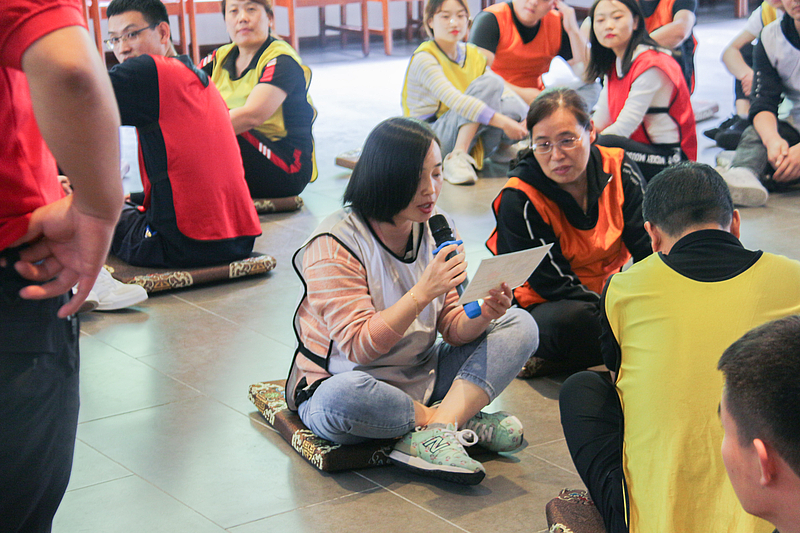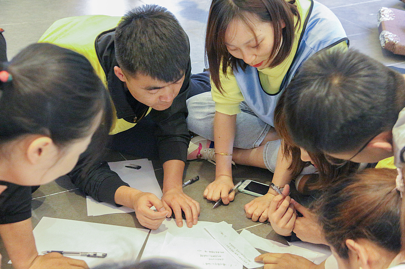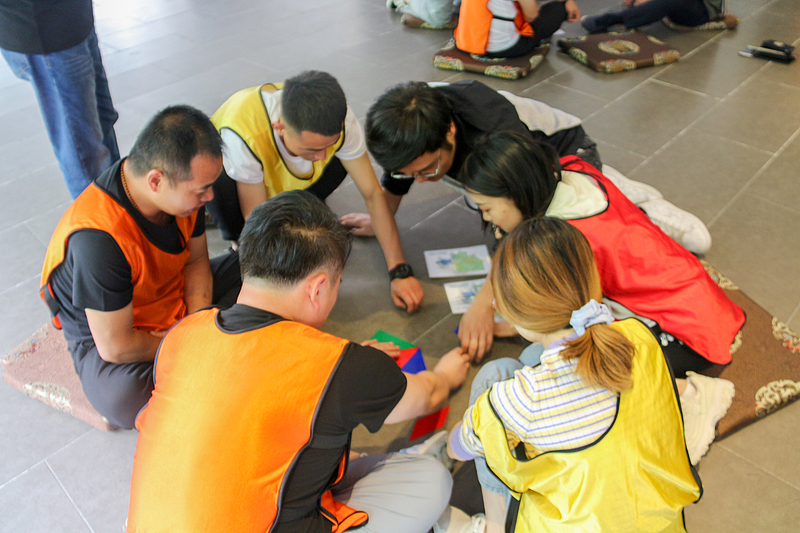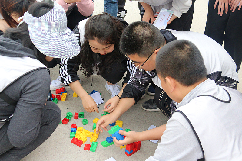 在“創(chuàng)新思維”和“啞人筑塔”活動環(huán)節(jié)中,需要各隊員在規(guī)定的時間內(nèi)有序完成各項挑戰(zhàn)任務。計時開始后,每支隊伍都全身心投入活動中,小分隊間的合作也更加得心應手。夏風輕拂,大家的興致也愈發(fā)高漲,不一會兒就有隊員示意教練已完成任務。
