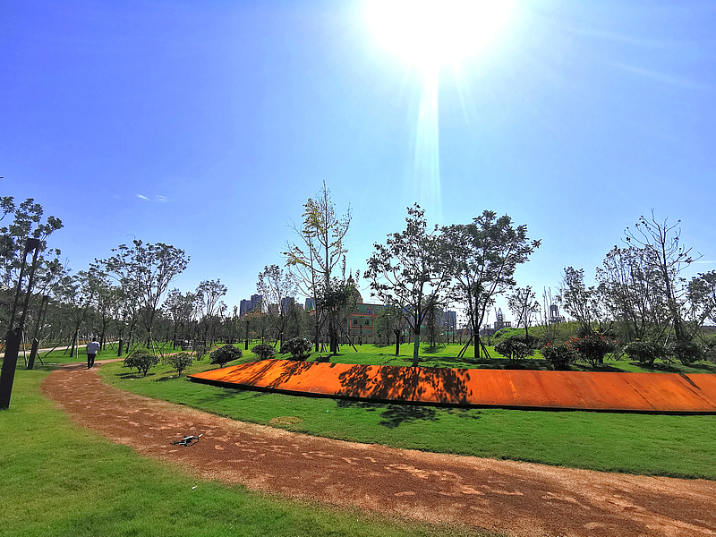 創(chuàng)新港綠楔:位于西部科技創(chuàng)新港科創(chuàng)板塊兩側(cè),東側(cè)為地鐵五號線,總占地37.5萬平方米,現(xiàn)已建成開放24.9萬平方米。通過四條楔形綠地連接南北生態(tài)環(huán)境,以水景湖系為主線,形成多元化雨洪調(diào)蓄系統(tǒng),配備多樣化戶外運動設施,通過綠化造景將自然風光與周邊建筑緊密融合,構(gòu)成整體化生態(tài)綠廊體系,展現(xiàn)積極向上、朝氣蓬勃的學鎮(zhèn)風貌。