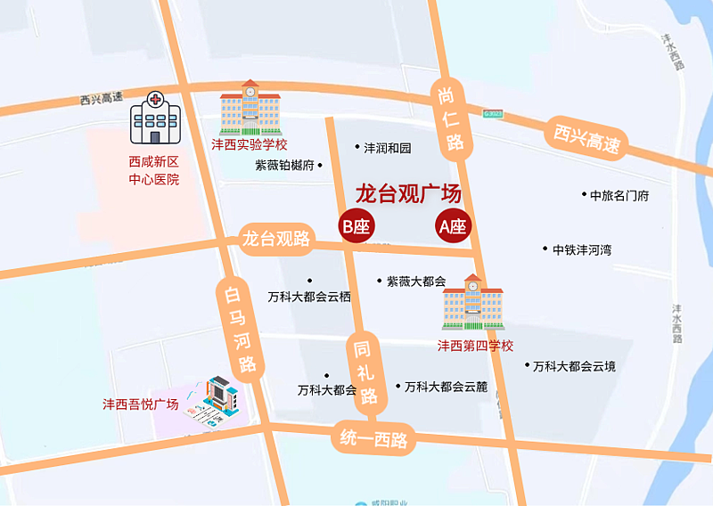 龍臺觀廣場商鋪位于灃西新城龍臺觀路與同禮路十字東北角、龍臺觀路與尚仁路十字西北角,為A、B兩座商業樓體,由地上五層和地下停車場組成,總建筑面積約32788m2,商鋪面積為107㎡--3115㎡不等,可根據商戶業態自由選擇。