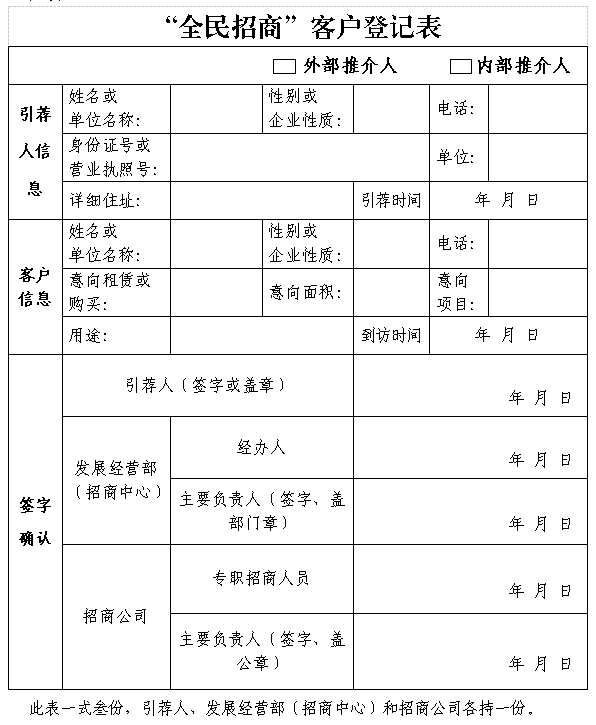 (三)客戶首次到訪,引薦人要與客戶同時(shí)到場(chǎng),招商公司和專(zhuān)職招商人員需在《“全民招商”客戶登記表》簽字蓋章確認(rèn)客戶為首訪。