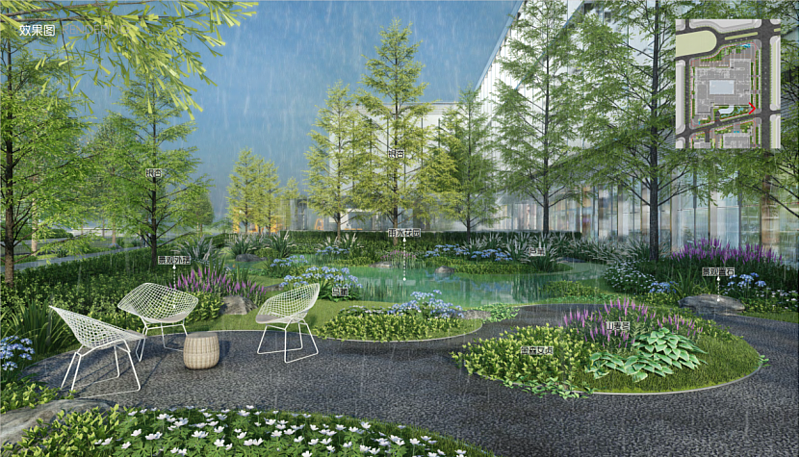 園區(qū)內(nèi)以簡潔的復(fù)層種植為主,堅持生態(tài)性,注重特殊性,考慮季相性,打造四季怡人的生態(tài)環(huán)境。采用區(qū)域喬木陣列式種植,形成規(guī)則種植形式;局部運用開花地被,形成簡潔飄逸的商業(yè)景觀空間;部分區(qū)域栽植草花地被,點綴銀杏,增加季相變化效果,形成視覺焦點。