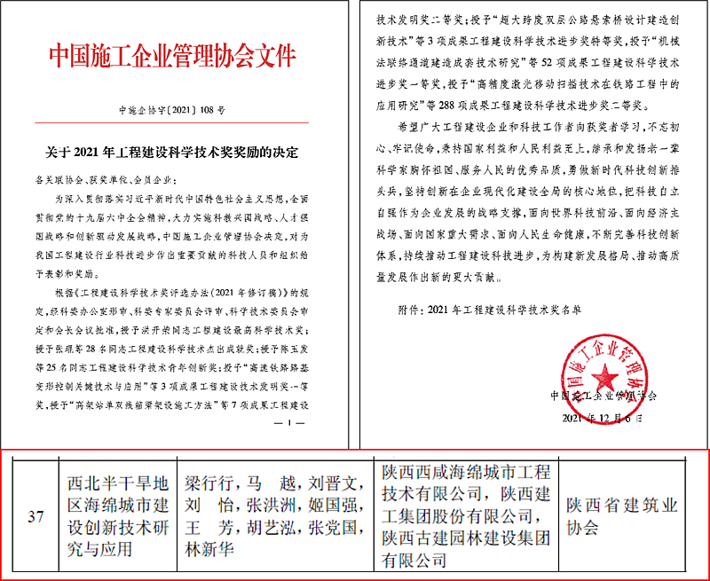 近日,灃西集團(tuán)海綿城市技術(shù)公司與陜西建工集團(tuán)股份有限公司、陜西古建園林建設(shè)集團(tuán)有限公司等共同申報的項目“西北半干旱地區(qū)海綿城市建設(shè)創(chuàng)新技術(shù)研究與應(yīng)用”榮獲中國施工企業(yè)管理協(xié)會2021年工程建設(shè)科學(xué)技術(shù)進(jìn)步獎二等獎。