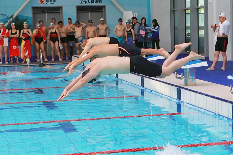本次比賽設置男子女子50米蛙泳、自由泳,團體200米蛙泳接力、200米自由泳接力和團體趣味賽等7個項目。參賽選手們個個摩拳擦掌,舒展筋骨,做足賽前熱身運動,欲一展水上風采。