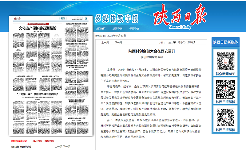 4月26日,陜西科創(chuàng)金融大會在西咸會議中心舉辦。本次活動由西咸新區(qū)和陜西金融資產(chǎn)管理股份有限公司(下稱“陜西金資”)主辦,陜西金資基金管理有限公司和西咸新區(qū)灃西新城基金管理有限公司承辦,邀請政府領(lǐng)導(dǎo)、金融專家、科學(xué)家、企業(yè)家、投資機(jī)構(gòu)共同探討金融服務(wù)科創(chuàng)、助力秦創(chuàng)原發(fā)展之路,通過基金揭牌、項目簽約、金融產(chǎn)品發(fā)布等系列重磅舉措為秦創(chuàng)原科技創(chuàng)...