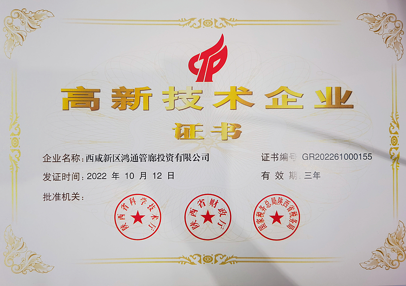 截至目前,獲得3項實用新型專利、3項發明專利、5項軟件著作權。2020年,榮獲西安市技術創新項目。2022年管廊公司先后完成2022年規模以上服務業企業入庫工作,并獲批2022年第一批高新技術企業。